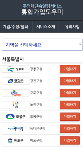 - 메뉴 선택 : 홈페이지에 접속하셨다면, 주정차단속 관리시스템이 운영되는 지역을 확인하고 자신의 거주지나, 자주 운전하는 지역을 선택하세요. 지역별로 차이가 있을 수 있으니 서비스 가입 전 주의 사항을 반드시 확인하셔야 합니다.